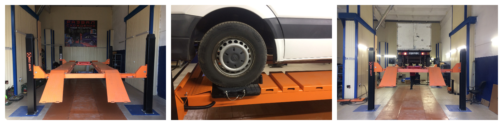 Четырехстоечный подъемник Well Kraft 4155E может работать как с автомобилями гольф класса, так и с бусами типа Sprinter/Crafter, или внедорожниками. Подъемник имеет платформы для работы с любыми стендами регулировки углов развал-схождение, будь то 3D развал или CCD.