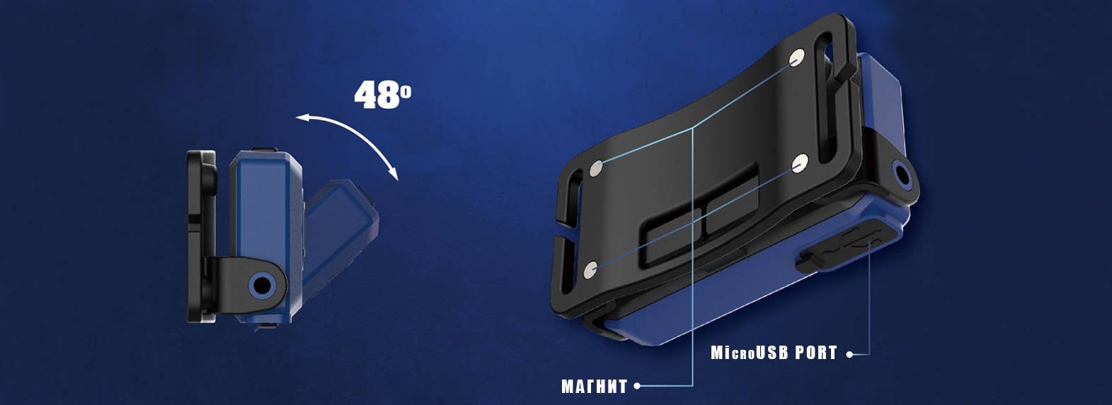 Особенностью такого фонарика является регулируемый наклон корпуса, это позволит направить свет туда куда Вам необходимо. Еще одно преимущество данной модели - отсоединение самого фонаря от головного крепления. Таким образом, благодаря наличию магнита на тыльной стороне, фонарь можно крепить к металлической поверхности.