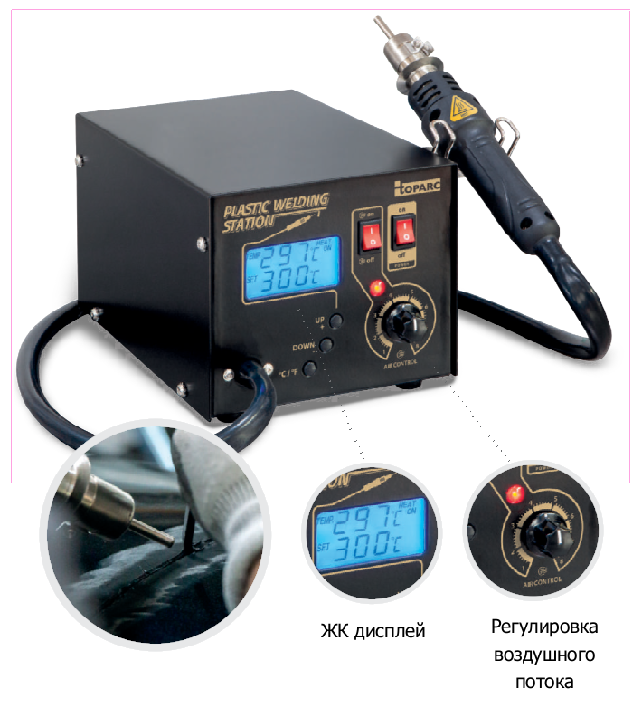 Простая в использовании, установка для сварки горячим воздухом пластмасс позволяет производить сварку пластмасс в автомобиле. Широкий регулируемый температурный диапазон (160-480 ° C) позволяет пластмассам нагреваться до температуры плавления, делая их пластичными и легко ремонтируемыми. Поток воздуха можно регулировать для поддержания однородного плавления пластика.