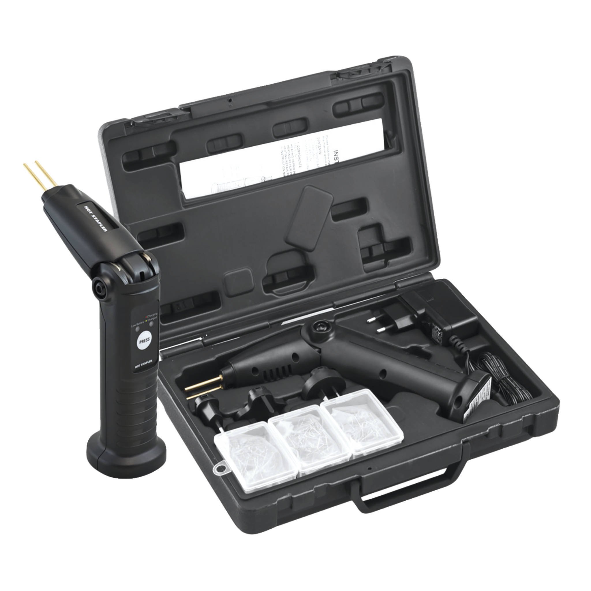 Прост в использовании: беспроводной степлер позволяет работать быстро и четко. Он позволяет укреплять и чинить все пластиковые части автомобилей путем нагрева скрепок их нержавейки разной формы.