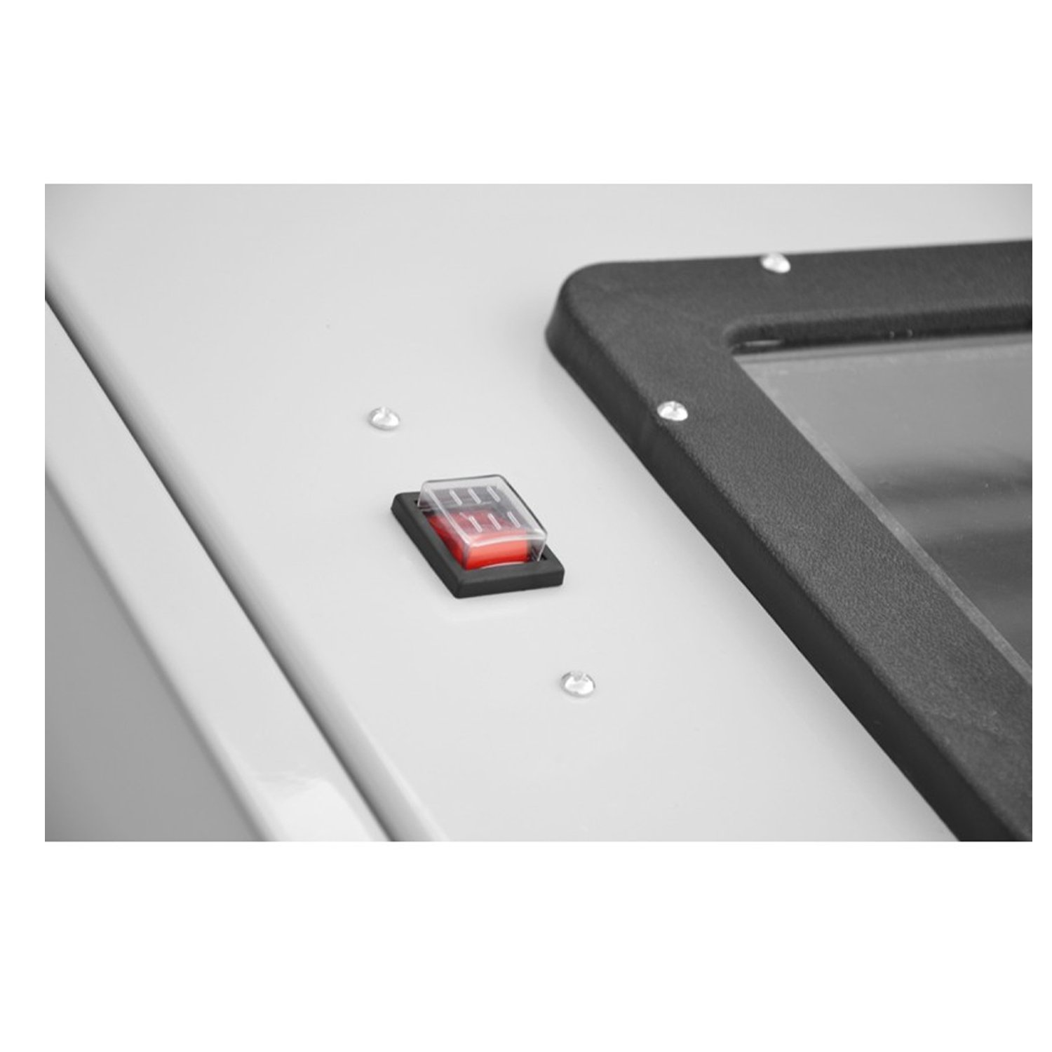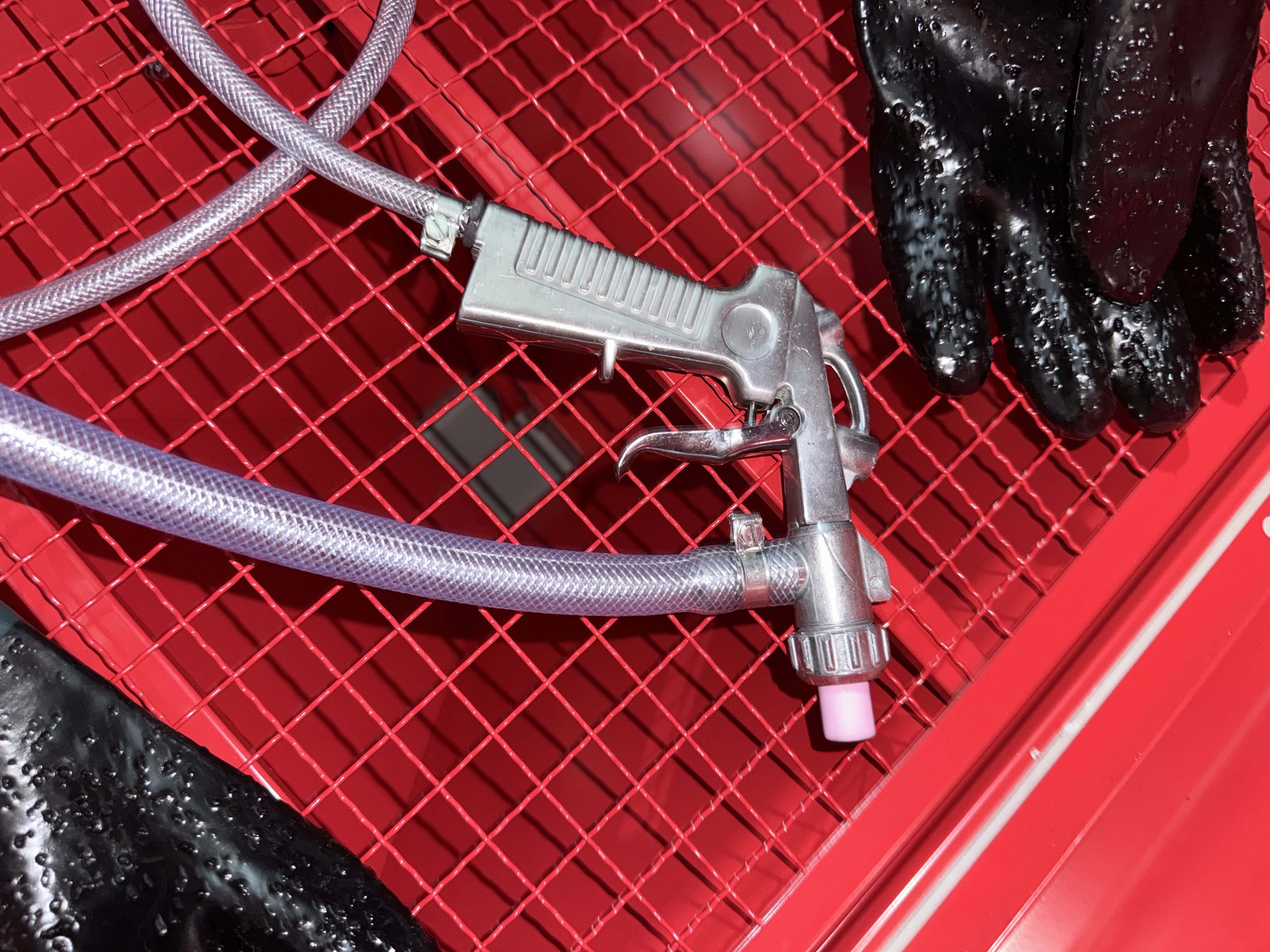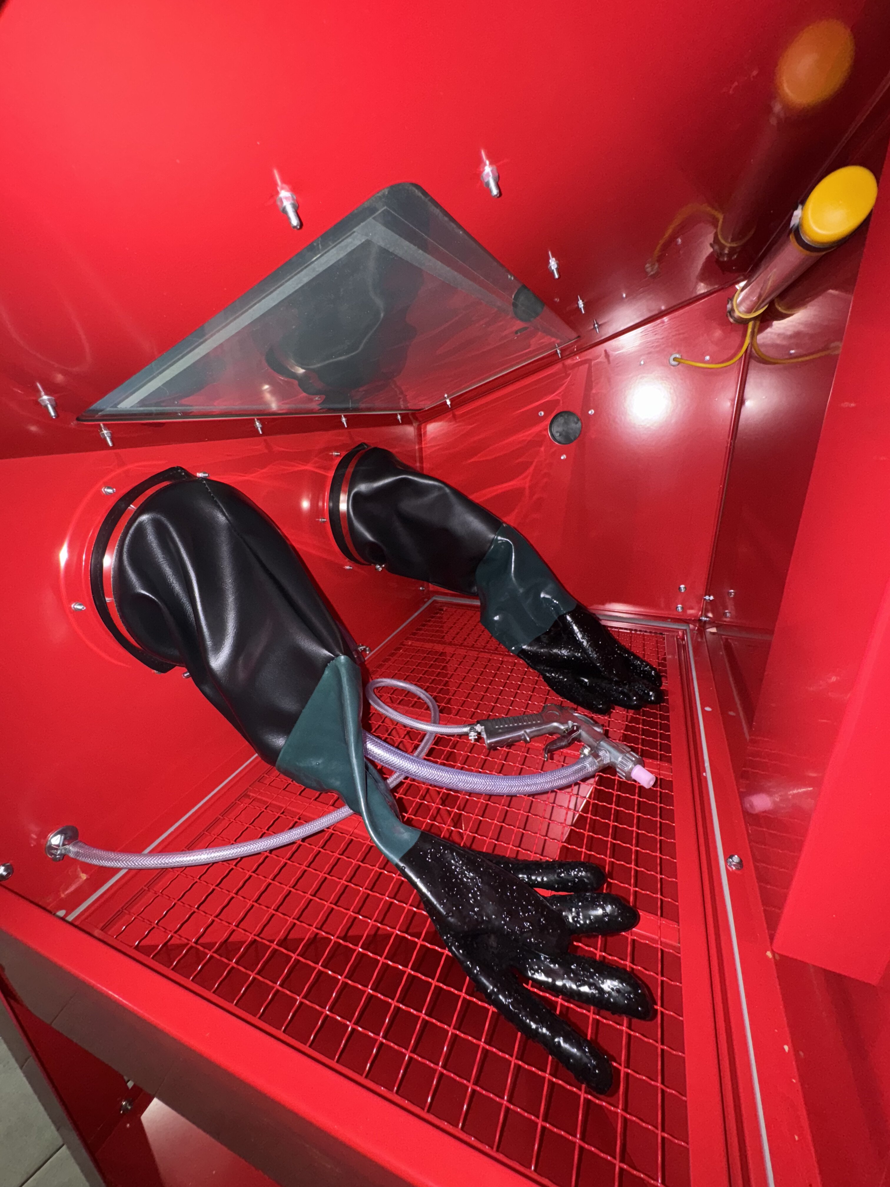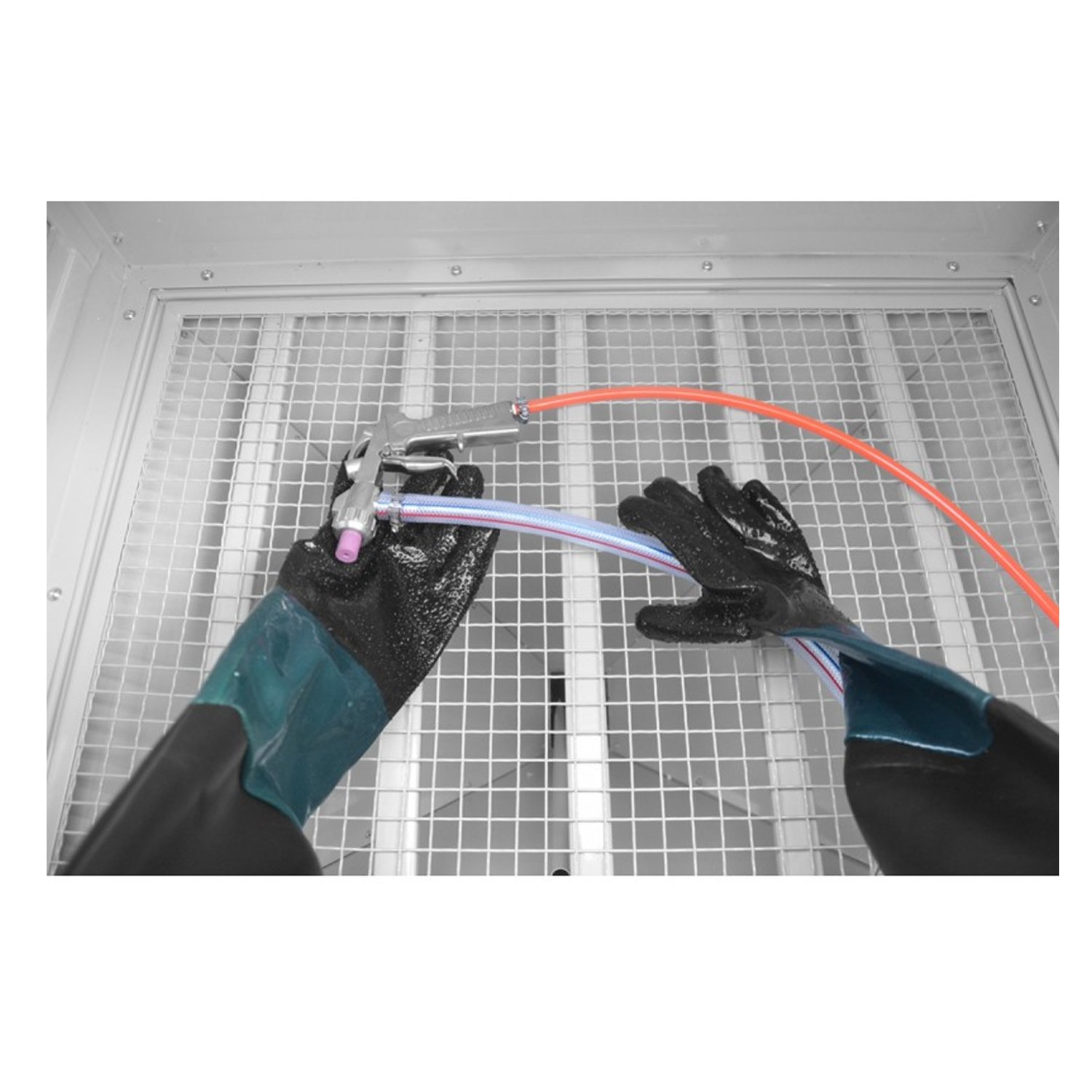 Піскоструминна камера оснащена зливною воронкою, яка забезпечує швидке відкриття та зручне видалення відпрацьованого абразиву. Товсті захисні рукавиці надійно захищають руки оператора під час роботи, а вбудоване внутрішнє освітлення гарантує відмінну видимість і комфорт під час піскоструминної обробки.