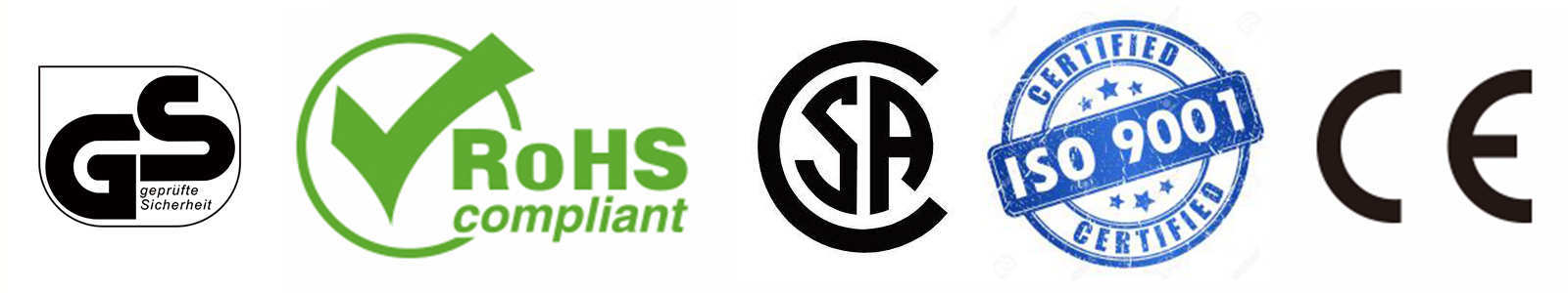 Компанія має сертифікати: ISO9001, ISO 14001, CE, GS, CSA, RoHS
